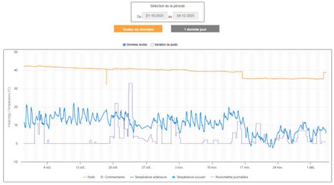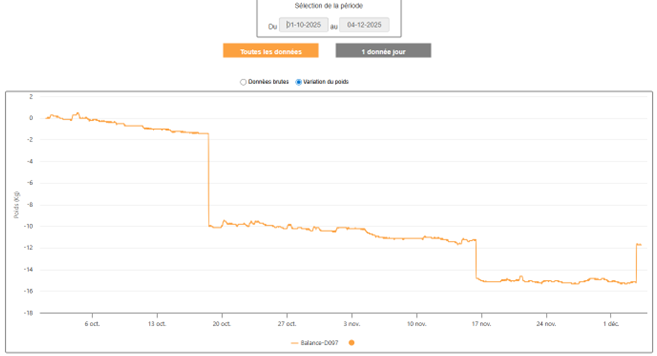 Le 18 octobre on note une importante variation de poids ( - 8 kg) alors que les autres données (poids, température et pluviométrie) sont stables et ne permettent pas d'expliquer cette perte de poids.